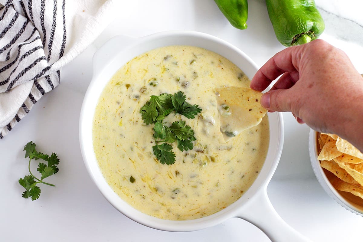 If you’ve ever made a thicker dip like queso with green chili or chili cheese dip, you’ve likely seen how adding liquid helps loosen and smooth the texture quickly.
